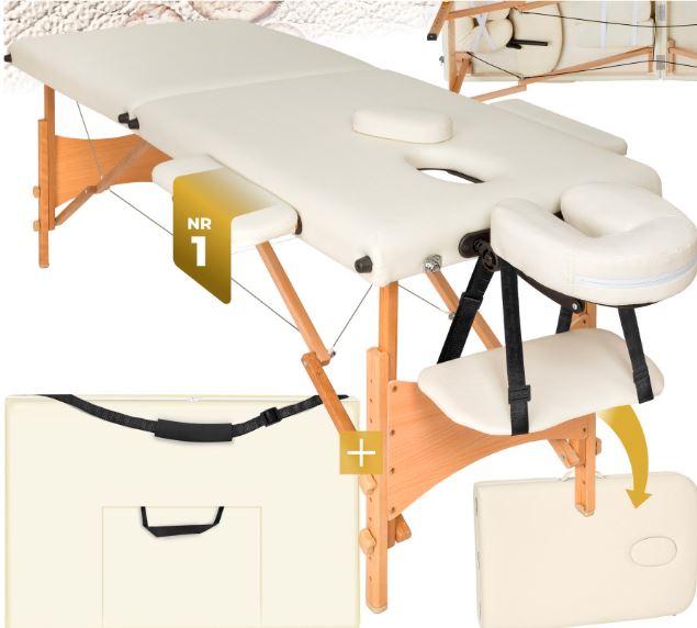 Dvodelna lesena masažna miza nudi udobno in sproščujočo podlago za optimalno komfortnost pri masaži.
