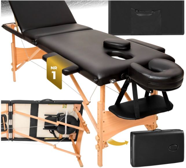 3 delna masažna miza je narejena iz trpežnega lesa. Dobro stabilna in primerna za vse vrste masaž. Poleg masažne mize je tudi torba za prenašanje.